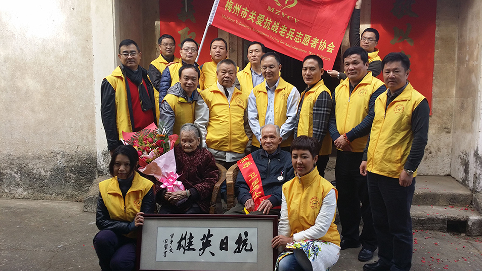 梅州市關(guān)愛抗戰(zhàn)老兵志愿者協(xié)會(huì)成立后,大力開展尋訪散居梅州山鄉(xiāng)的抗戰(zhàn)老兵,為尋訪到的每位抗戰(zhàn)老兵舉行民間簡(jiǎn)樸又莊重的“贈(zèng)章授榮”儀式、為困難老兵提供基本生活保障、為抗戰(zhàn)老兵提供日常生活照顧、為老兵過生日、重大節(jié)日慰問、生病看望看護(hù)、為抗戰(zhàn)老兵留影留聲、留手印,歸隊(duì)致以哀榮等等關(guān)愛活動(dòng),以熱心和誠(chéng)心,為抗戰(zhàn)老兵送去“遲到的榮譽(yù)”和慰藉。經(jīng)協(xié)會(huì)理事會(huì)研究,決定對(duì)抗戰(zhàn)老兵進(jìn)行日常關(guān)愛的同時(shí),給幸存抗戰(zhàn)老兵每月500元的致敬金。通過發(fā)放關(guān)愛金和致敬金,使老兵每月能獲得1100元的生活保障。2014年9月至2018年5月,廣東省雁洋公益基金會(huì)發(fā)放葉劍英基金關(guān)愛金380多萬元,協(xié)會(huì)動(dòng)員社會(huì)各界熱心人士和志愿者38600多人次,行程逾10萬公里,為抗戰(zhàn)老兵發(fā)放致敬金及其它慰問金等700多萬元,為抗戰(zhàn)老兵發(fā)放御寒物資一大批、保健品和日常生活用品、慰問品一大批,為住院就醫(yī)的抗戰(zhàn)老兵送上慰問金和輪值守護(hù)陪伴,累計(jì)為300多位梅州抗戰(zhàn)老兵及老兵遺孀,廣東以外800多位抗戰(zhàn)老兵及老兵遺孀送上了最真摯的關(guān)懷。